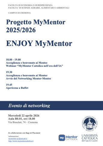 On April 22, 2026, at the Cremona Campus of Università Cattolica del Sacro Cuore, the event “ENJOY MyMentor” took place as part of the MyMentor 2025/2026 program, involving mentees, mentors and the university community in a moment of reflection, discussion and networking.